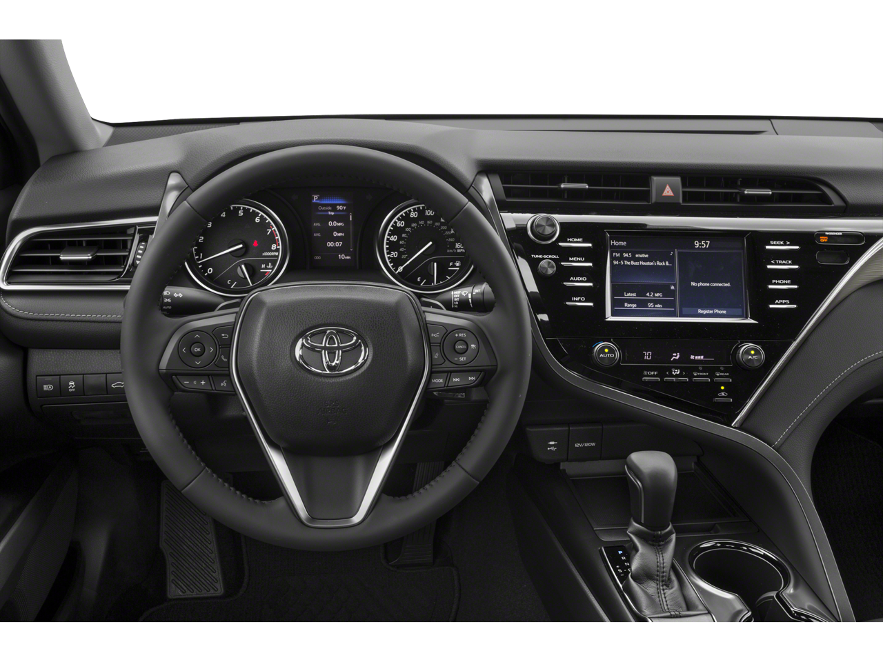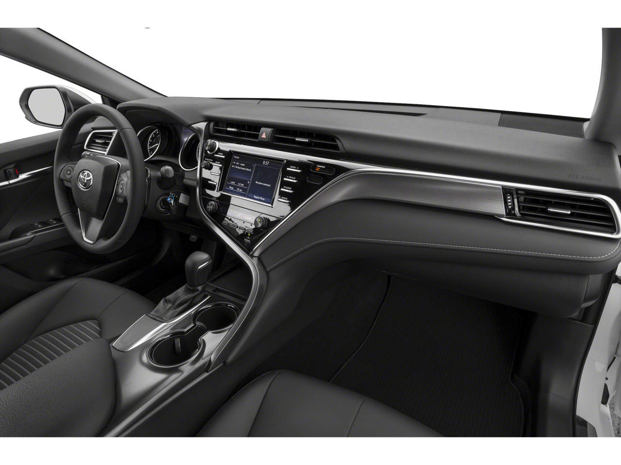 Inside, the Camry SE offers a wealth of advanced features, including Remote Keyless Entry, Traction Control, ABS Brakes, Low Tire Pressure Warning, Electronic Stability Control, Active Cruise Control, and Illuminated Entry. The cabin is also equipped with a premium audio system, dual-zone automatic climate control, and a rearview camera for added convenience and safety.