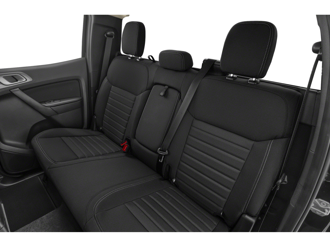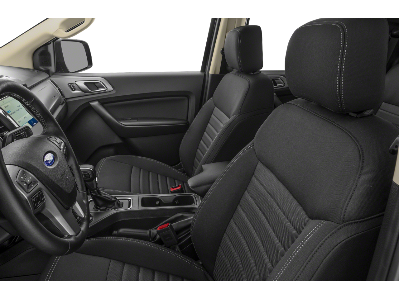 The Ranger XLT's striking exterior is highlighted by the Magnetic Painted Front & Rear Bumper, Black Door Handles, and Black Mesh Grille with Magnetic Painted Surround and Red Accent Nostrils. The 18 Matte Black wheels and 5 Rectangular Black Running Boards add a bold, sporty touch. Inside, the Front Cloth Bucket Seats with Ash Gray Accent Stitching and Leather-Wrapped Steering Wheel create a refined and comfortable cabin.